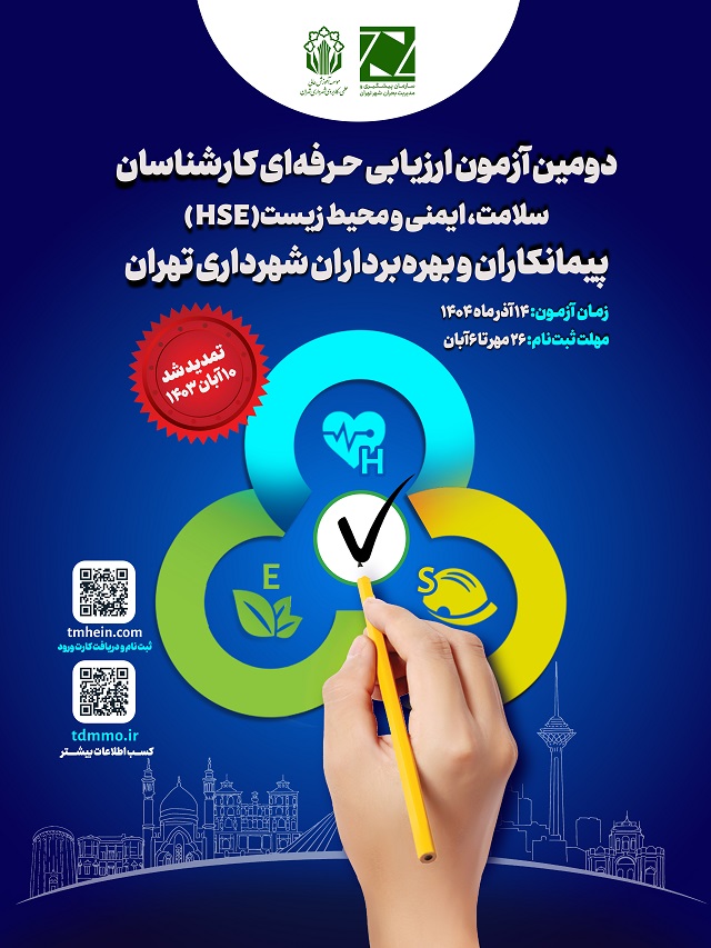 دبیرخانه سلامت، ایمنی و محیطزیست (HSE) شهرداری تهران مستقر در سازمان پیشگیری و مدیریت بحران شهر تهران از تمدید مهلت ثبتنام دومین آزمون جامع ارزیابی حرفهای کارشناسان سلامت، ایمنی و محیطزیست (HSE) ...