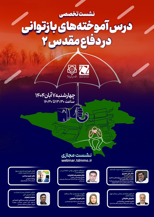 نشست تخصصی «درسآموختههای بازسازی و بازتوانی در دفاع مقدس2» روز چهارشنبه 7 آبان 1404 از ساعت 13 تا...