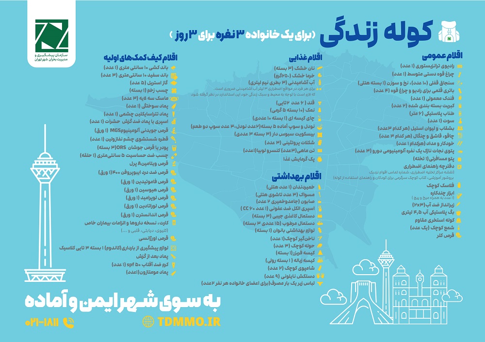 "کوله زندگی" اقدامی هوشمندانه در راستای تابآوری شهری در برابر بحرانها است. شهروندان تهرانی میتوانند با تهیه این اقلام و نگهداری آن در مکانی مشخص، گامی مؤثر در افزایش امنیت خانواده خود بردارند.